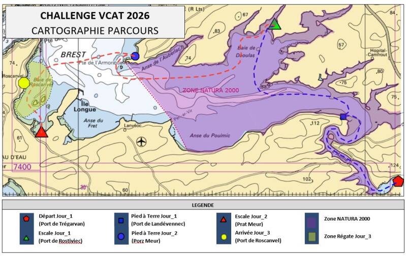 Préparez-vous à plonger au cœur de l'action ! Le Challenge VCAT vous invite à découvrir un programme riche en défis et en découvertes. Des méandres de l'Aulne à la majestueuse Rade de Brest, chaque étape est une promesse d'aventure. Découvrez ci-dessous les détails de nos journées de navigation, conçues pour les passionnés de voile et d'exploration. Notez que, quelques jours avant l'événement les photos ci-après seront remplacées par les cartes détaillées avec chaque parcours.